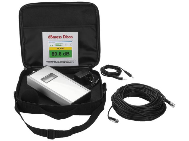 Sound level measuring system, consisting of a sound level meter and software. The LEVELMAX-1 system is a combination of a software with an especially developed sound level meter (class 2) which measures the Leq. The scope of delivery includes 2 versions of the software: the first version features measuring parameters which can universally be matched and also allow the applications if legal grounds change. The second version (дБmess swiss) additionally corresponds to the requirements of the Swiss noise emission and laser directive (SLV), version dated 1 May 2007. The LEVELMAX system is tailor-made for the application in discotheques but also allows mobile applications without major restrictions. Leq, Li, Lmax, Lpeak and other values which are relevant for protecting the hearing are detected, stored and can be evaluated The most important values are displayed in an especially clearly arranged graph Compared with the quality and amount of stored data, the operation is really easy The additional system requirements are at a minimum and can also be met by customary laptops without any difficulties A remote inquiry is possible via an implemented webserver Detected values: The instantaneous value is displayed with the time rating F (fast), S (slow) and I (impulse) as well as a peak value During the respective measurement, the following values are detected (and stored) Energy-equivalent average value Leq (дБmess swiss: additionally Leq 60) Max. value Lmax Peak value Lpeak Frequency weighting (A) is done via the LEVELMAX sound level meter Evaluation: The detected values are stored every minute Leq, Lmax and Lpeak can be detected for any time period required Easy operation: Measurements are started and stored automatically Automatic administration of backup files Present values can easily be identified in the display, partly with a variable traffic light system Remote inquiry: The unit can operate as a HTTP webserver. As soon as a TCP/IP connection is established, the prograммe can be accessed via any web browser If another webserver is already used by the PC, another port number can be allocated in order to use both webservers at the same time Multi-lingualism: The prograммe can be changed to other languages At present German, English and French are available Scope of delivery: Sound level meter Power supply Microphone with cable (33 m) and windshield AC cable for connection to a PC Software Carrying bag System requirements: PC with sound card, Windows* 7/8/10 (32-bit/64-bit version) software update for older versions of Windows can be downloaded from our website Graphics: A perfectly clear display of all measured values with regard to the colour limits set can be found on the register page "Graphics".It is also possible to highlight an area (drag from the left to the right) which then appears dark blue in the graph. On the left side of this area, the evaluation can be found regarding time period, number of measured values (was the system in continuous operation?) as well as Leq, Lmax and Lpeak. Thus, the user can evaluate any time period and accurately show how the levels were located during the time periods which might possibly be in question. Individual values: On the register page "Individual values", a list of the measured minute values can be found for both of the channels which can be selected as desired.